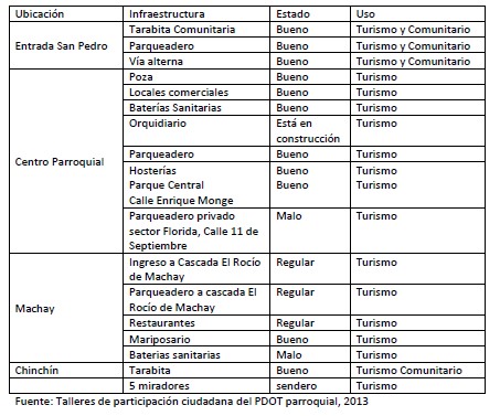 La Parroquia empezó en la actividad turística con la exposición de la Cascada Pailón del Diablo, esta cascada es considerada como uno de los saltos más grandes del Ecuador tiene aproximadamente 80 metros de altura, la hermosa e impresionante cascada tiene dos saltos de agua (el Encañonado del Duende y Pailón del Diablo) los mismos que debido a la fuerza con la que caen, forman un impresionante remolino. El nombre de “Pailón del Diablo”, se debe a la forma que tiene una roca de la cascada; la cual mirándola desde el puente colgante, muestra las facciones y el rostro recostado del “Príncipe de las Tinieblas”